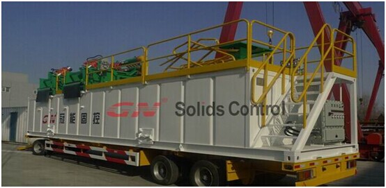 冠能150GPM泥漿系統配置如下 1、1臺GNZS703D雙層振動篩上安裝了3個4寸除泥旋流器,通過GNZS703D雙層篩可以把粗砂除去,然后通過除泥旋流器把20um左右以上的顆粒在分離除去, 2、2臺GNSB4X3-12J的砂泵安裝在泥漿罐斜倉上,1臺用于給除泥器供漿,另外1臺作為混漿泵使用。 3、4米長的泥漿罐,非常緊湊的設計跟合理的布局,對于狹小的鉆井空間非常適宜。